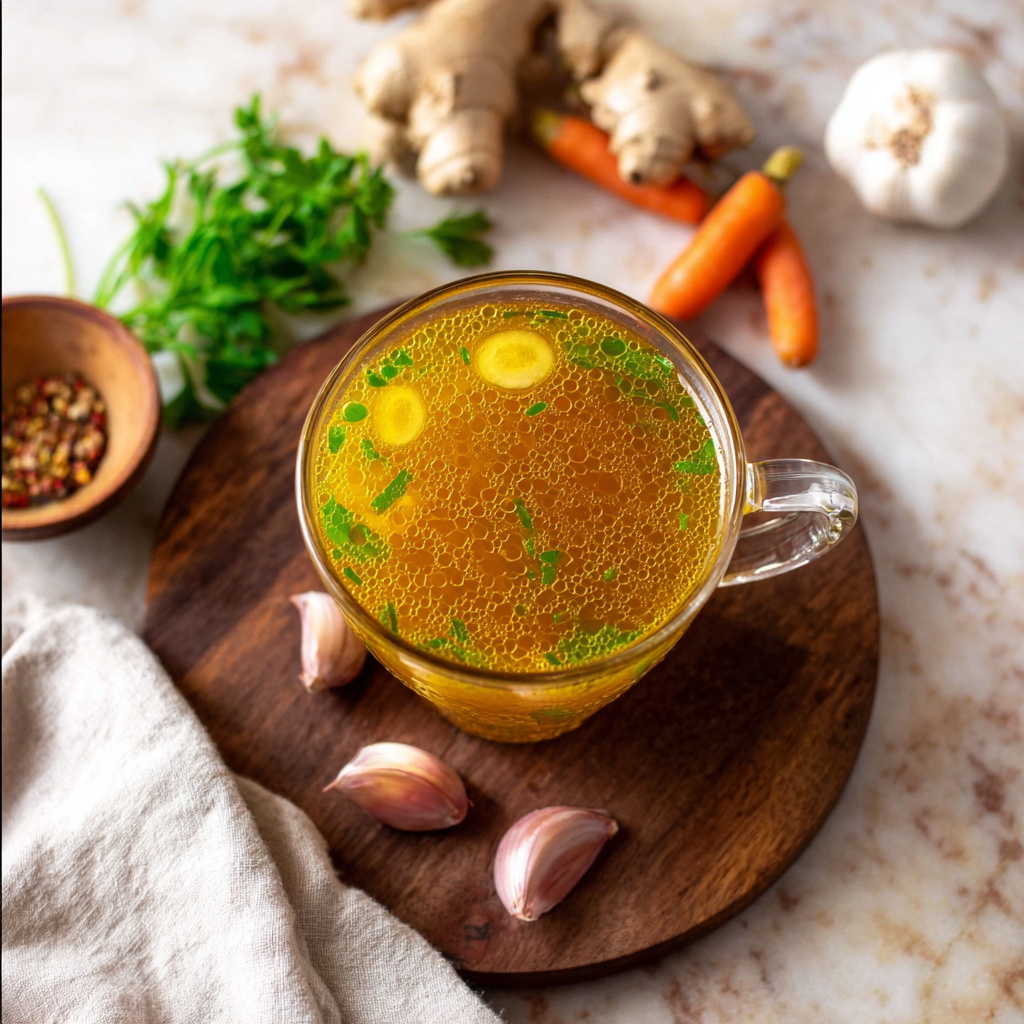 - ¼ Tasse Knochenbrühe oder Pilzbrühe – stärkt Darm & Abwehr