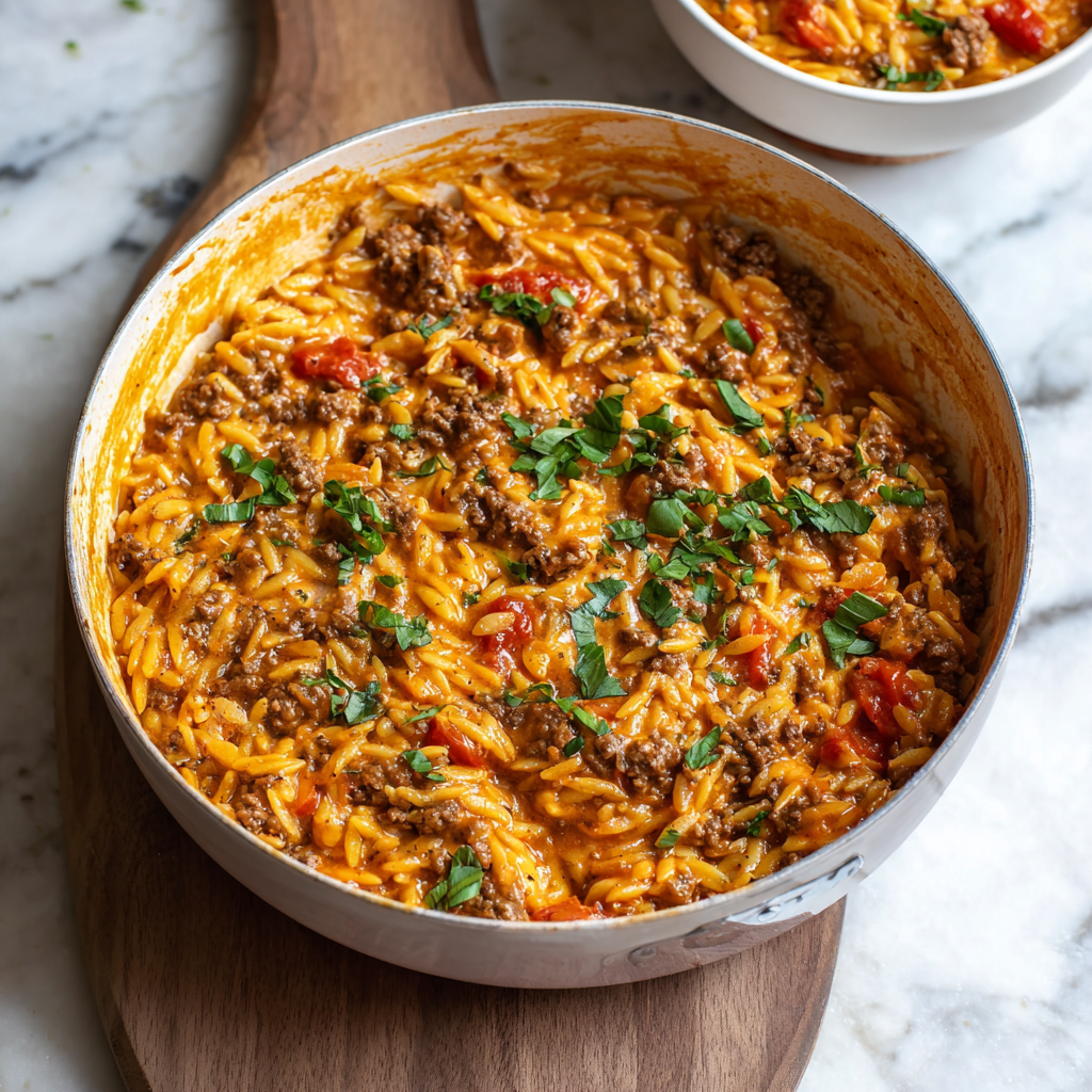 Ein-Topf-Hackfleisch-Orzo mit cremiger Tomatensoße