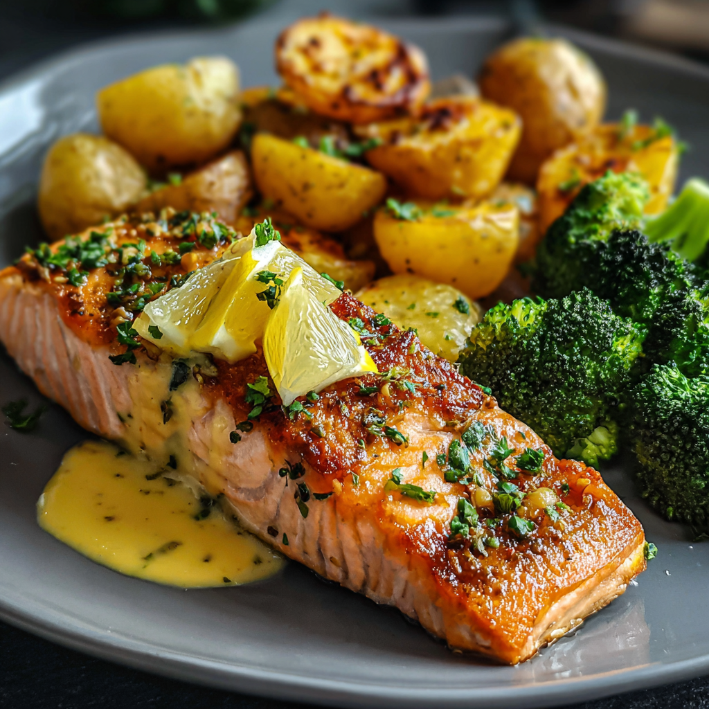 Zitronenbutterlachs mit knusprigen Kartoffeln und Brokkoli