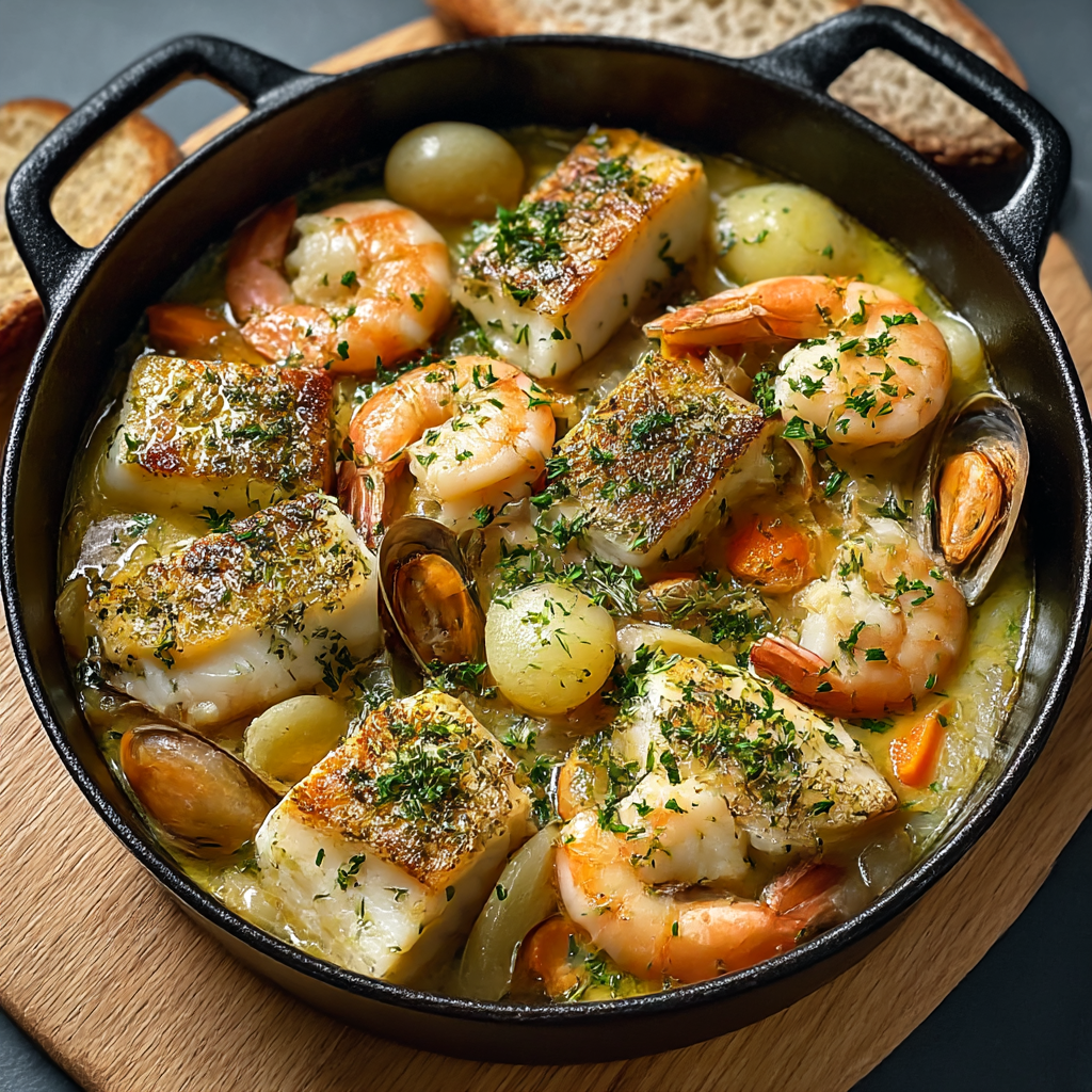 Haben Sie sich jemals gefragt, wie man ein cremiges französisches Fischgericht zaubert, das aromatisch, elegant und einfach zuzubereiten ist? Diese Cassolette de Poissons et Crevettes – eine klassische französische Spezialität – vereint zarten Fisch, saftige Garnelen und eine cremige Weißweinsauce, überbacken mit einer goldenen Kruste.