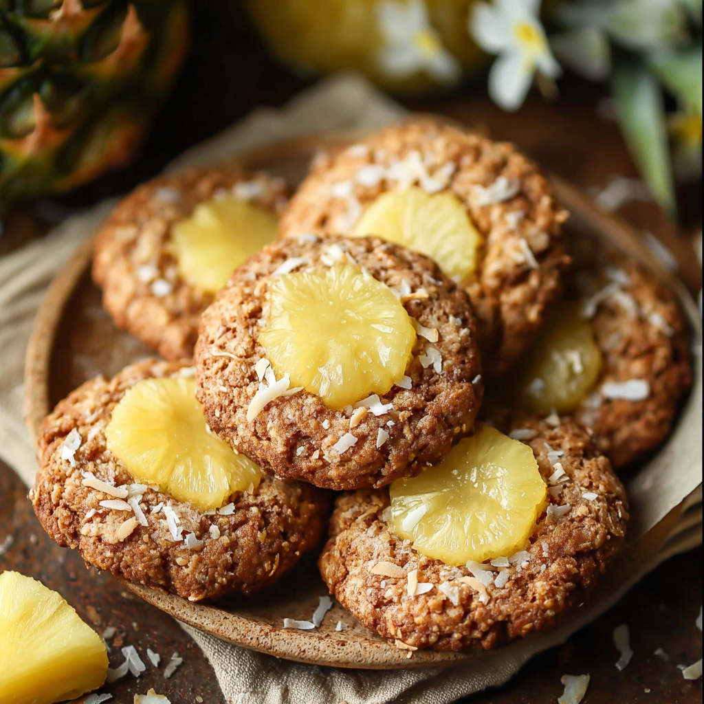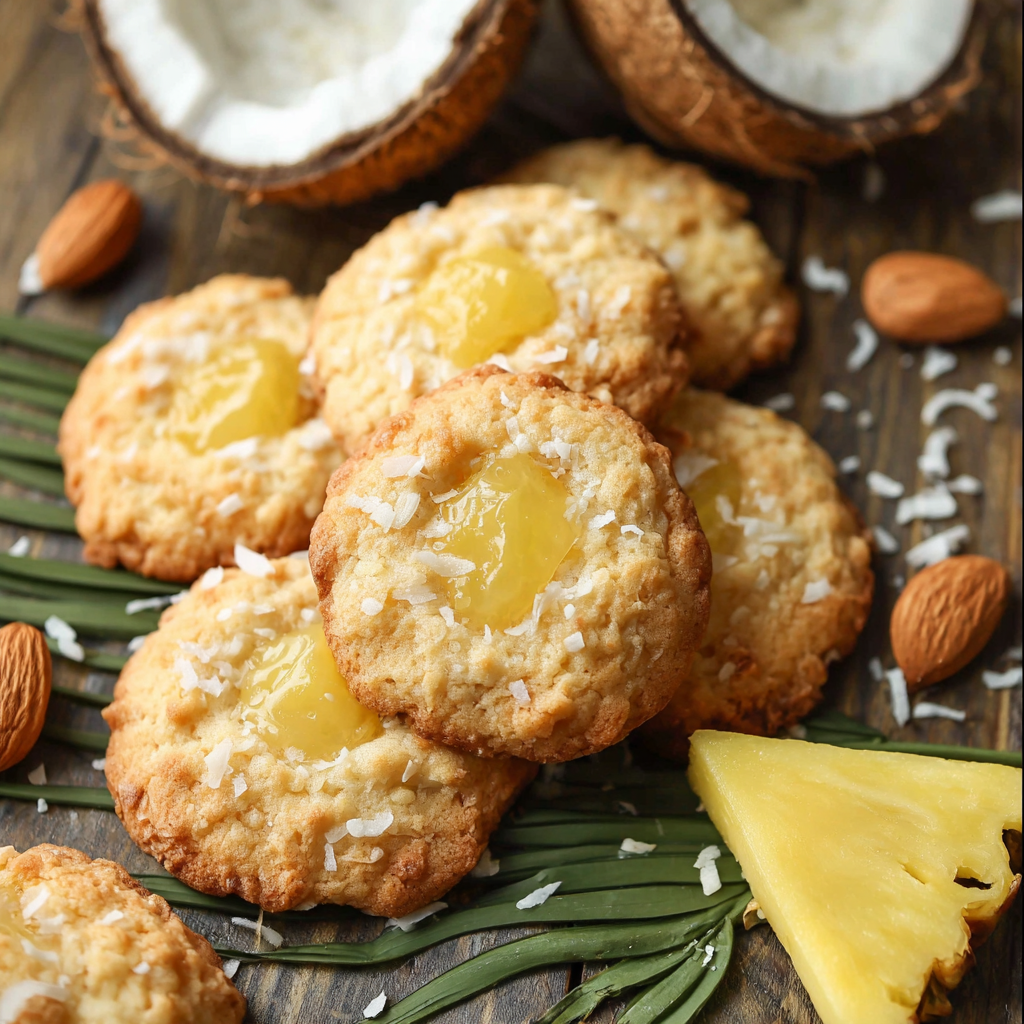 (NLP-Keywords: Ananas-Kekse, Kokosnuss-Cookies, tropische Plätzchen, hawaiianisches Gebäck, exotische Cookies, Sommerkekse, Kekse mit Früchten, Urlaubskekse, Kokoskekse)