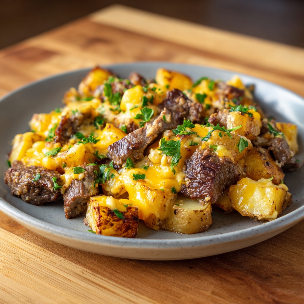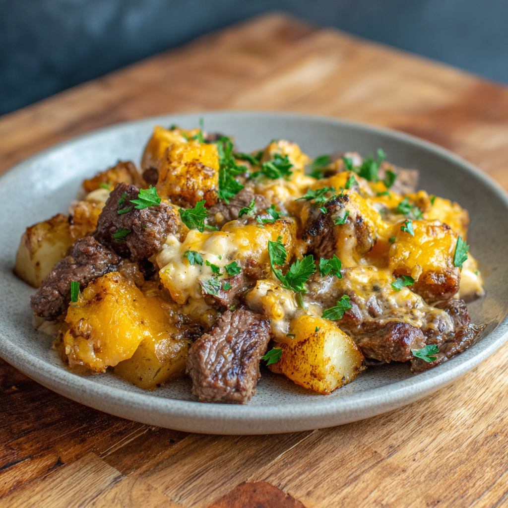 Dieses Rezept für langsam gegartes Steak mit käsigen Kartoffeln ist ein echter Wohlfühlklassiker: zartes Rindfleisch, geschmolzener Käse und cremige Kartoffeln – alles in einem Topf, ohne Stress.