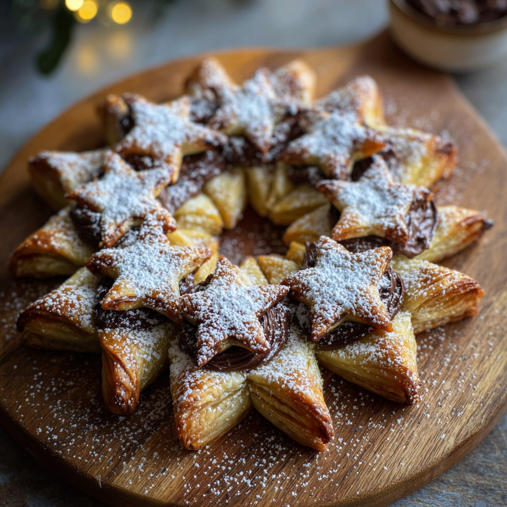 Dieser Kranz besteht aus zartem Blätterteig, der mit cremiger Nutella-Schokoladen-Nuss-Creme geschichtet und kunstvoll verdreht wird, sodass ein leuchtender Stern entsteht. Außen goldbraun, innen weich und schmelzend süß — ein Dessert, das sofort Weihnachtsstimmung verbreitet.
