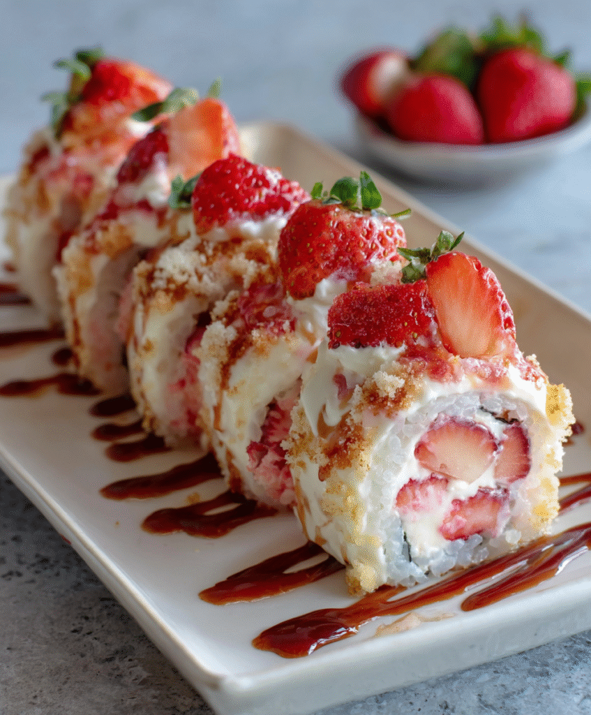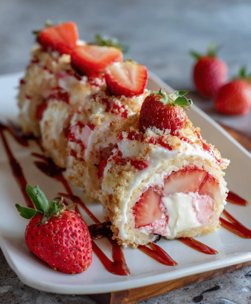 Diese Strawberry Shortcake Sushi Rolls sind eine kreative und süße Interpretation des beliebten amerikanischen Erdbeer-Shortcakes – verpackt als handliche Sushi-Rollen. Weicher Kuchen oder Biskuit, frische Erdbeeren und süße Creme verbinden sich zu einem beeindruckenden Dessert, das auf Partys und beim Nachmittagskaffee garantiert begeistert.