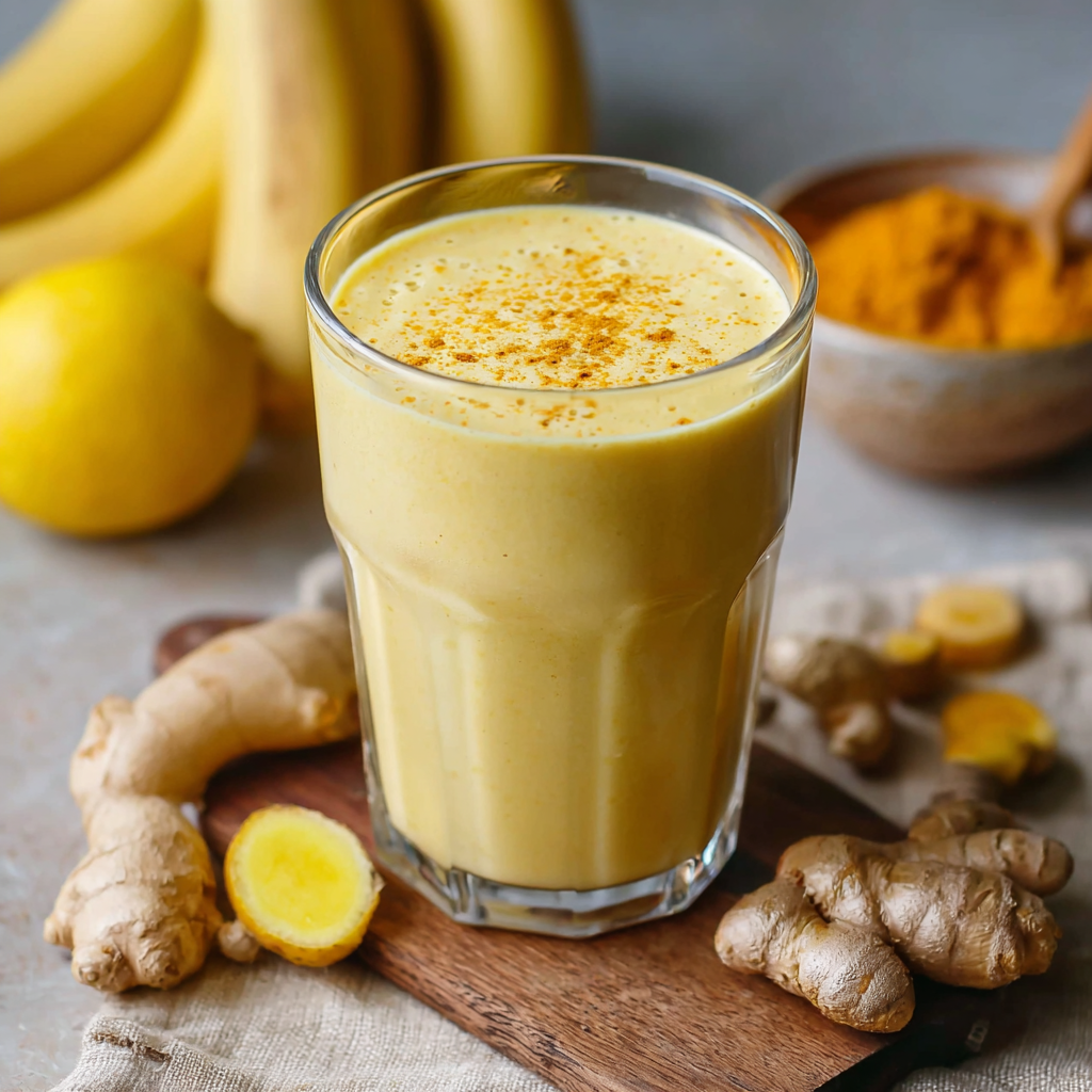Der Zitronen-Ingwer-Smoothie mit Banane und Kurkuma ist ein schneller, gesunder Muntermacher, der Immunität unterstützt und lecker schmeckt. Perfekt für Morgen, Mittag oder als Snack.